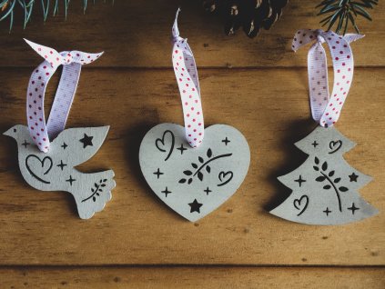Vianočná sada pozostáva zo 7 ks drevených ozdôb v bielo-červenom prevedení, ktoré oživia každý tradičný vianočný stromček.