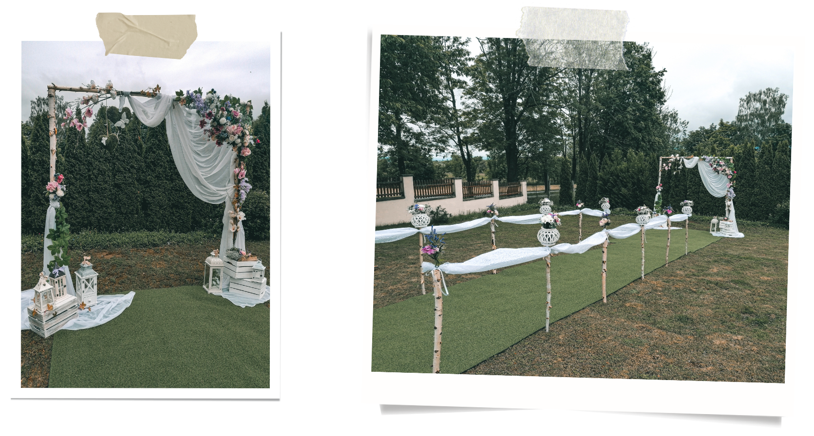 Svadobný obrad sme plánovali v záhrade cirkevného zboru. U tety sa akurát pílili brezy, a tak sme využili odpílené drevo a vyrobili si slávobránu z brezového dreva. Výzdoba tejto slávobrány bola plne v réžii mojej tety. Jediné čo som jej povedala, bola moja predstava, ktorú nielenže naplnila, ale ju aj prekonala.