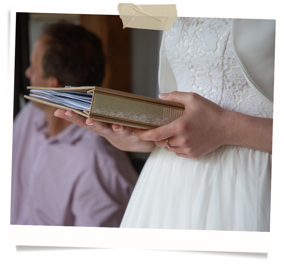 Drevenú krabičku som si ako polotovar kúpila v obchode, natrela belinkou a doplnila vyrezaným dreveným textom z vonkajšej strany, a dvomi srdiečkami z vnútornej strany otváracej časti s iniciálkami našich mien a dátumom svadby. Krabičku som vyplnila jutou s čipkou, do ktorej sme vložili obrúčky. Na otváraciu časť krabičky som nakoniec prilepila biely čipkový pás.